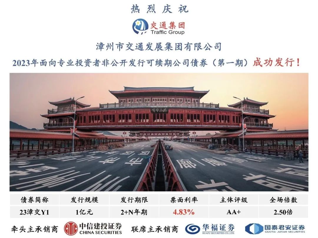 2月27日,漳州市交通發(fā)展集團(tuán)有限公司2023年面向?qū)I(yè)投資者非公開(kāi)發(fā)行可續(xù)期公司債券(第一期)簿記發(fā)行,由中信建投證券擔(dān)任牽頭主承銷商,華福證券和國(guó)泰君安證券擔(dān)任聯(lián)席主承銷商,發(fā)行規(guī)模1億元,期限2+N年期,票面利率4.83%,全場(chǎng)認(rèn)購(gòu)倍數(shù)2.50倍。