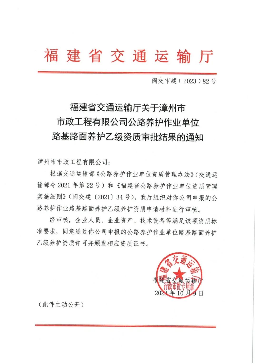 近日,漳州交通集團權(quán)屬交發(fā)建設(shè)集團所屬市政公司成功增項公路養(yǎng)護作業(yè)單位路基路面乙級、特種工程(結(jié)構(gòu)補強)專業(yè)承包資質(zhì)。此次資質(zhì)增項進一步加強和完善了公司路基路面、特種工程的業(yè)務(wù)體系,拓展了公司業(yè)務(wù)鏈條,標志著市政公司資質(zhì)建設(shè)再上新臺階!