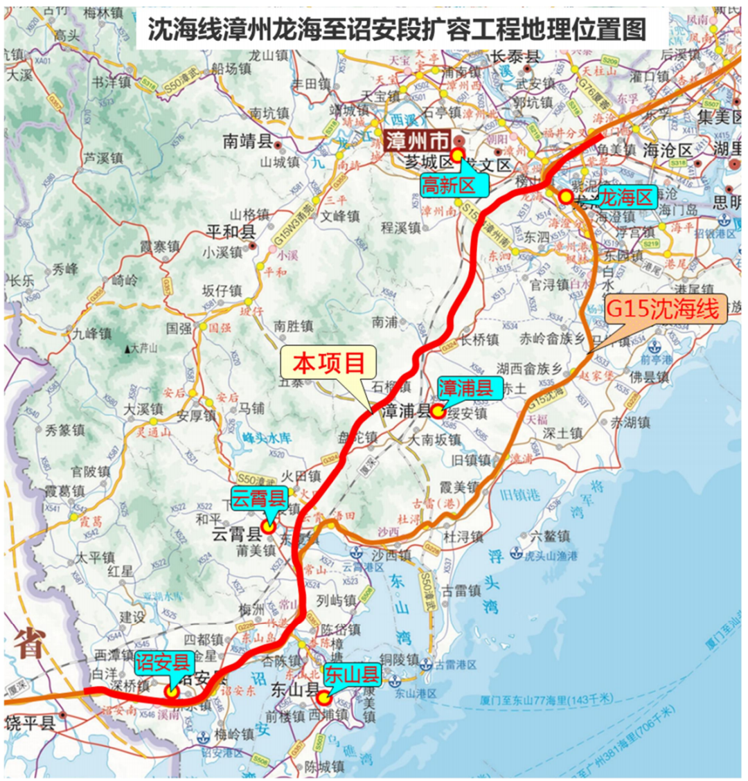 沈海線漳州龍海至詔安段(龍海北溪頭至詔安閩粵界)擴容工程是省政府“十四五”期間規(guī)劃建設項目,也是國家高速公路網規(guī)劃“一縱”沈海高速公路的重要組成部分。項目全長約132公里,路線途經龍海區(qū)、高新區(qū)、漳浦縣、云霄縣、常山華僑經濟開發(fā)區(qū)、詔安縣,設計時速120公里/小時,項目估算總投資約242.3億元。