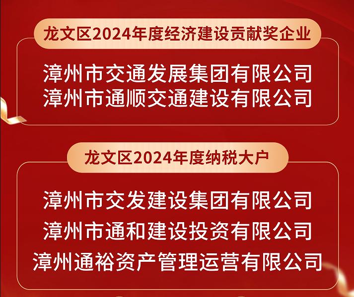 此外,漳州交通集團權(quán)屬漳州市通順交通建設有限公司亦獲得“龍文區(qū)2024年度經(jīng)濟建設貢獻獎”,漳州市交發(fā)建設集團有限公司、漳州市通和建設投資有限公司、漳州市通裕資產(chǎn)管理運營有限公司同時獲得“龍文區(qū)2024年度納稅大戶”表揚。