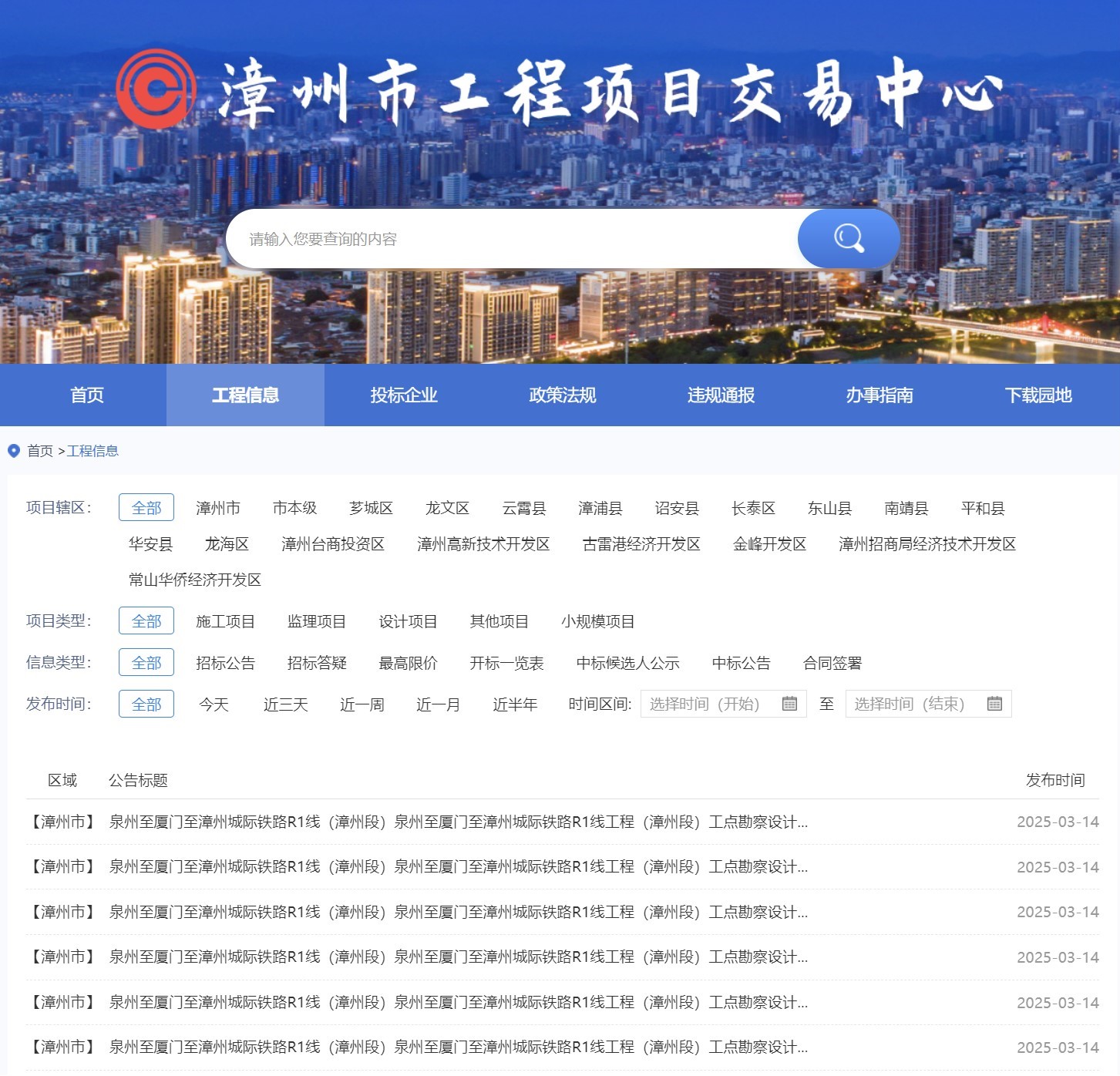 作為R1線項目漳州段業(yè)主單位的漳州市鐵路投資開發(fā)有限公司,將嚴格落實公開透明招投標程序,確保項目高效推進。同時,招標公告同步在“福建省公共資源交易電子公共服務平臺”和“漳州市工程項目交易中心”發(fā)布,公眾可通過該平臺查詢詳細信息。