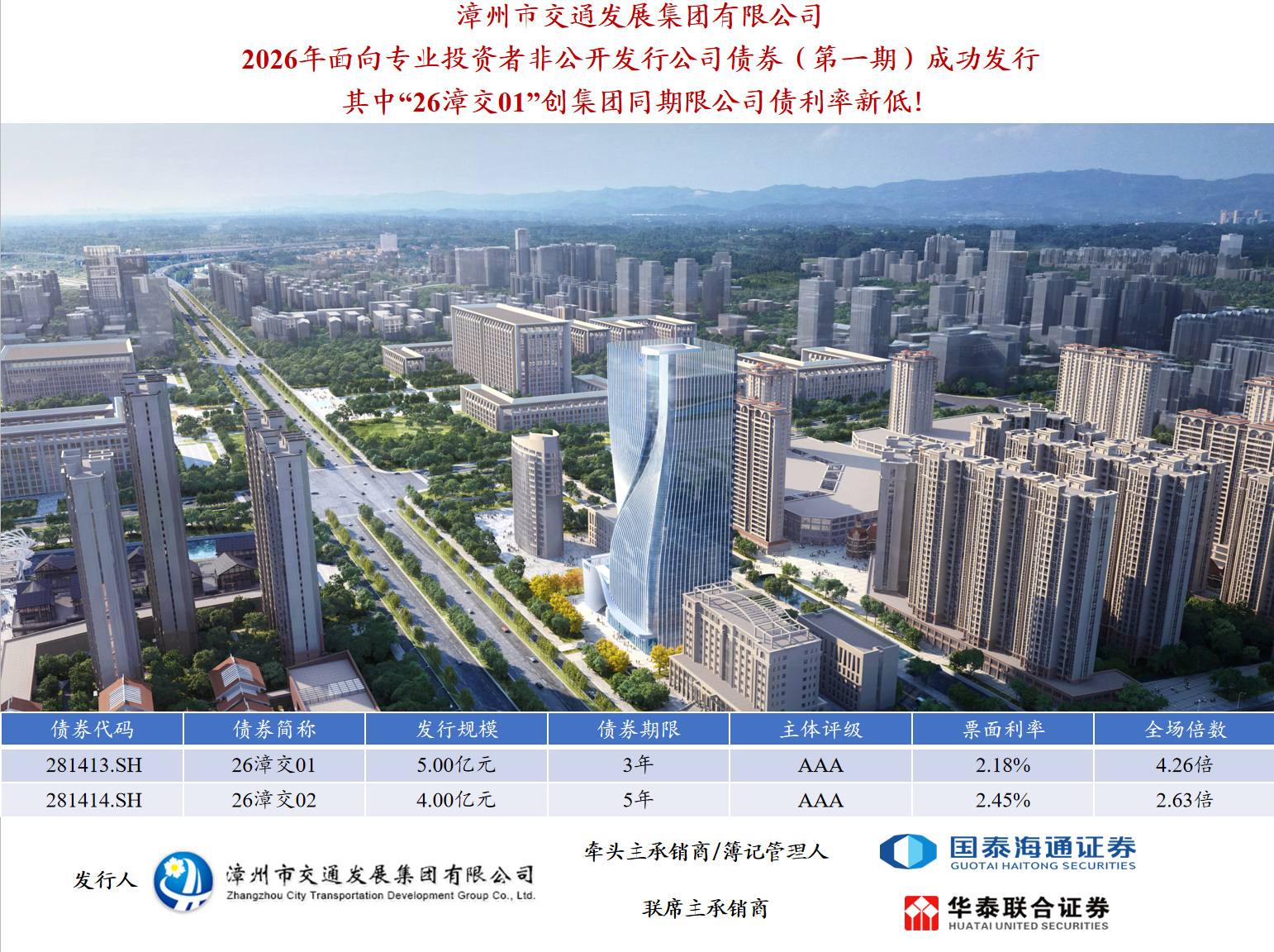 本期債券為雙品種債券,其中26漳交01發(fā)行期限3年期,發(fā)行規(guī)模5億元,票面利率2.18%,全場(chǎng)倍數(shù)4.26倍;26漳交02發(fā)行期限5年期,發(fā)行規(guī)模4億元,票面利率2.45%,全場(chǎng)倍數(shù)2.63倍。本期債券由牽頭主承銷(xiāo)商國(guó)泰海通證券和聯(lián)席主承銷(xiāo)商華泰聯(lián)合證券共同承銷(xiāo),其中26漳交01創(chuàng)下集團(tuán)同期限公司債利率新低!