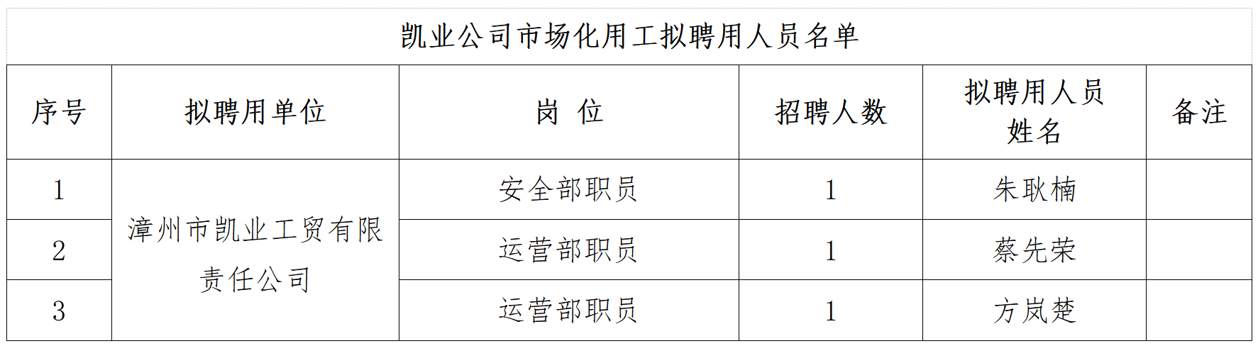 根據(jù)《漳州市交發(fā)工貿(mào)集團(tuán)有限公司所屬凱業(yè)公司市場(chǎng)化用工人員招聘公告》相關(guān)規(guī)定,經(jīng)報(bào)名、資格審查、面試、背景調(diào)查、體檢、政審等程序,現(xiàn)將擬聘用3名人員予以公示,具體名單如下: