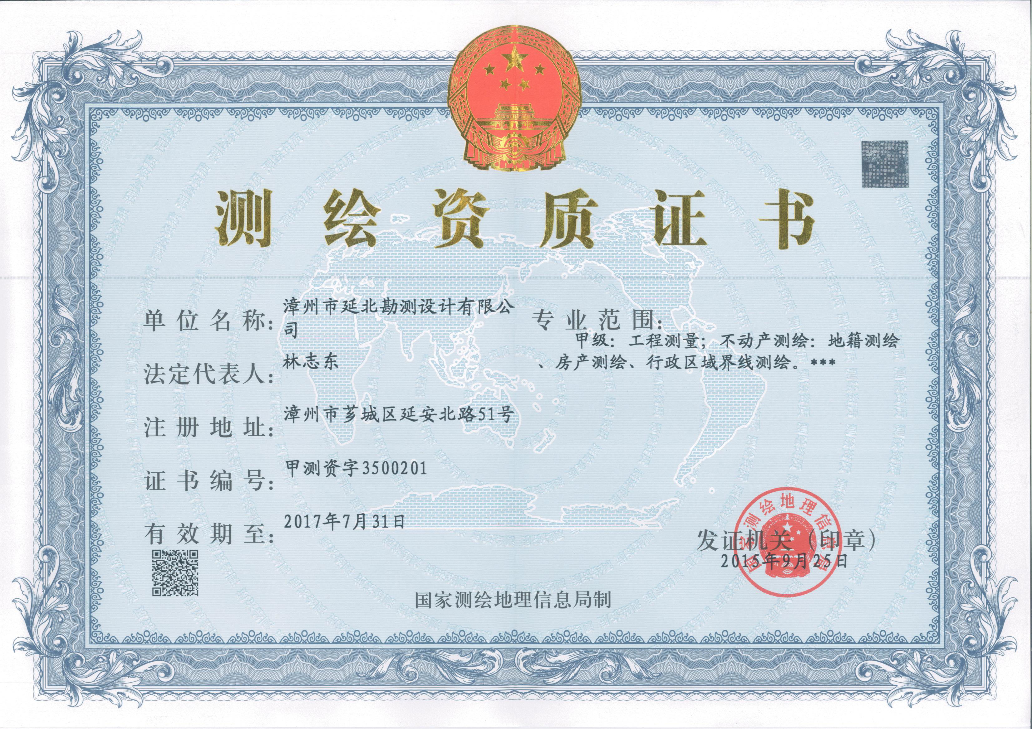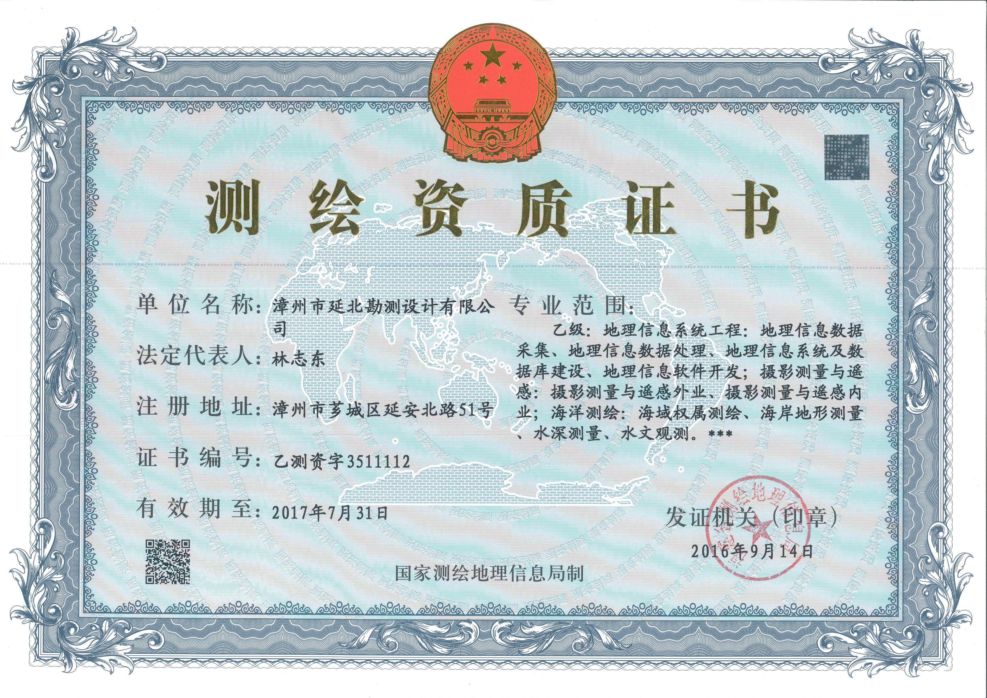 漳州通正勘測設(shè)計(jì)院有限公司為目前漳州唯一一家測繪甲級的國有企業(yè),在同行業(yè)中具備較強(qiáng)的竟?fàn)幜Α?/SPAN>為進(jìn)一步拓展測繪業(yè)務(wù)范圍,不斷增強(qiáng)測繪綜合實(shí)力,通正設(shè)計(jì)院在去年測繪資質(zhì)升級為甲級資質(zhì)(工程測量、地籍測繪、房產(chǎn)測繪)的基礎(chǔ)上,積極努力地進(jìn)行測繪資質(zhì)增項(xiàng)申報(bào)工作。經(jīng)福建省測繪地理信息局的嚴(yán)格審查,2016年9月,正式通對了通正設(shè)計(jì)院測繪資質(zhì)增項(xiàng)申請,批準(zhǔn)了“攝影測量與遙感、海洋測繪”兩個增項(xiàng)為乙級資質(zhì)。